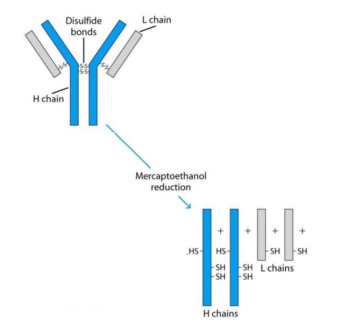 - Case #3? 펩신과 파파인에 비하면 아직 문제에서 본 적은 없지만 만일 환원제인 beta- mercaptoethanol을 처리하면 중쇄와 경쇄를 이어주는 이황화 결합이 (--S--) 환원돼서 (--SH) 4개의 펩티드로 존재하게 된다.