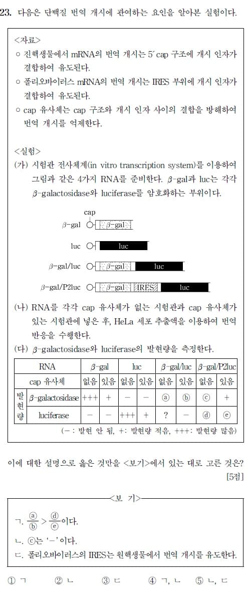 B-gal/P2luc는 IRES가 삽입됐으니 일단 번역은 되지만 cap에 영향을 받지 않으니 확실히 알 수 있는 건 d와 e의 발현량은 동일하며 d/e = 1이란 것. 즉 보기를 해석하면 3 > 1.