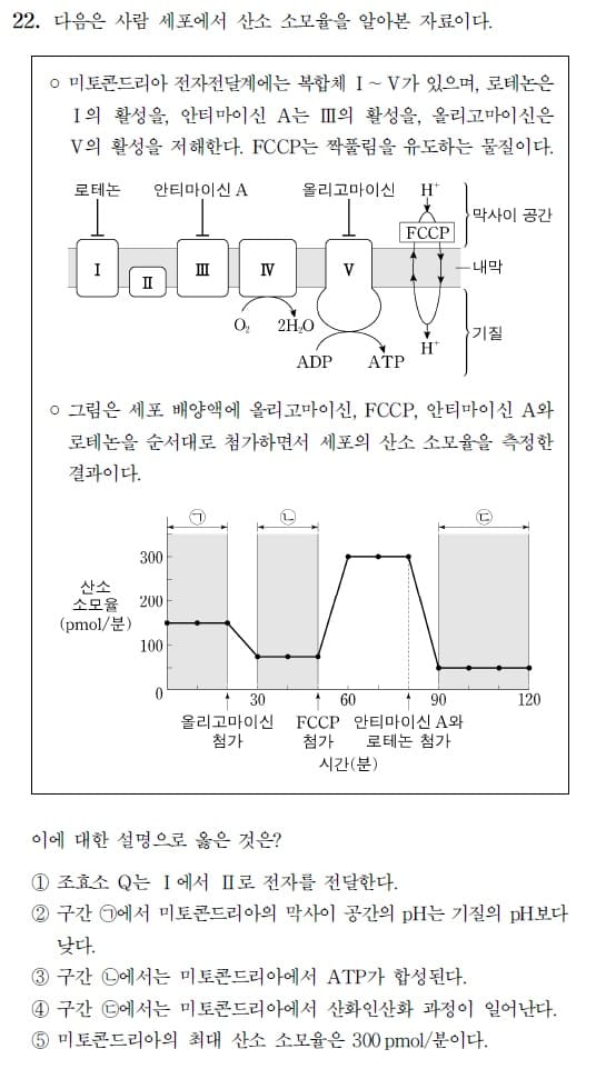 4) 틀림 ㄷ는 로테논: I 억제제 안티마이신 A: III 억제제 올리고마이신: ATP 합성효소 억제제 FCCP 짝풀림제 등등 많은 저해제로 인해 산화인산화는 불가능하다. II, IV가 살아있어도 III이 이 중간과정을 중개해주지 못하기 때문에 소용없음