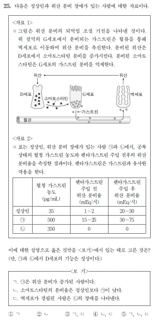 ㄴ) 틀림. D세포가 위산에 반응해서 소마토스타틴을 분비한다. 정상인보다 위산 분비가 증가되었으니 그에 비례해 소마토스타틴의 분비율도 증가할 것임으로 정상인보다 높다.