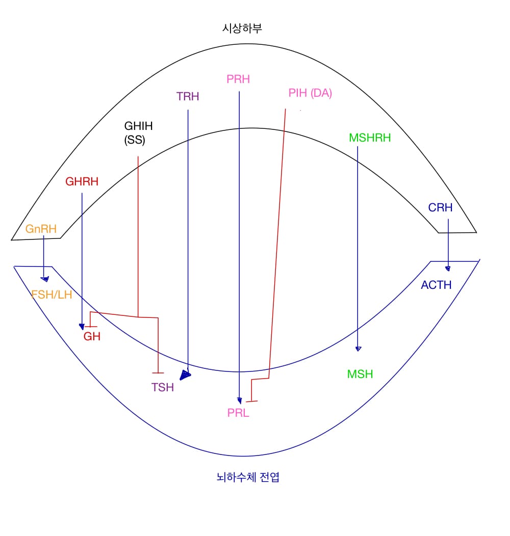 - 시상하부가 분비하는 대부분의 호르몬은 뒤에 RH가 붙는데 이는 Releasing Hormone(방출호르몬)의 약자로 말그대로 특정 호르몬을 방출하라고 신호를 보내는건데 이걸 뇌하수체가 받고 그에 상응하는 호르몬을 분비한다. 마치 영양호르몬 같이 행동하지만 시상하부 출신 호르몬은 방출 호르몬이라고 지칭한다.