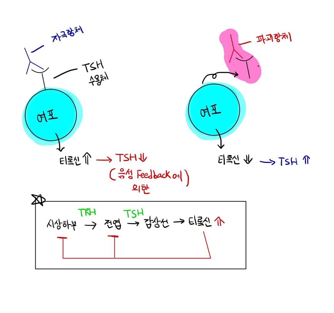 - 티록신은 과다 분비시 시상하부와 전엽에 음성피드백을 걸어 TRH 와 TSH의 분비를 조절함