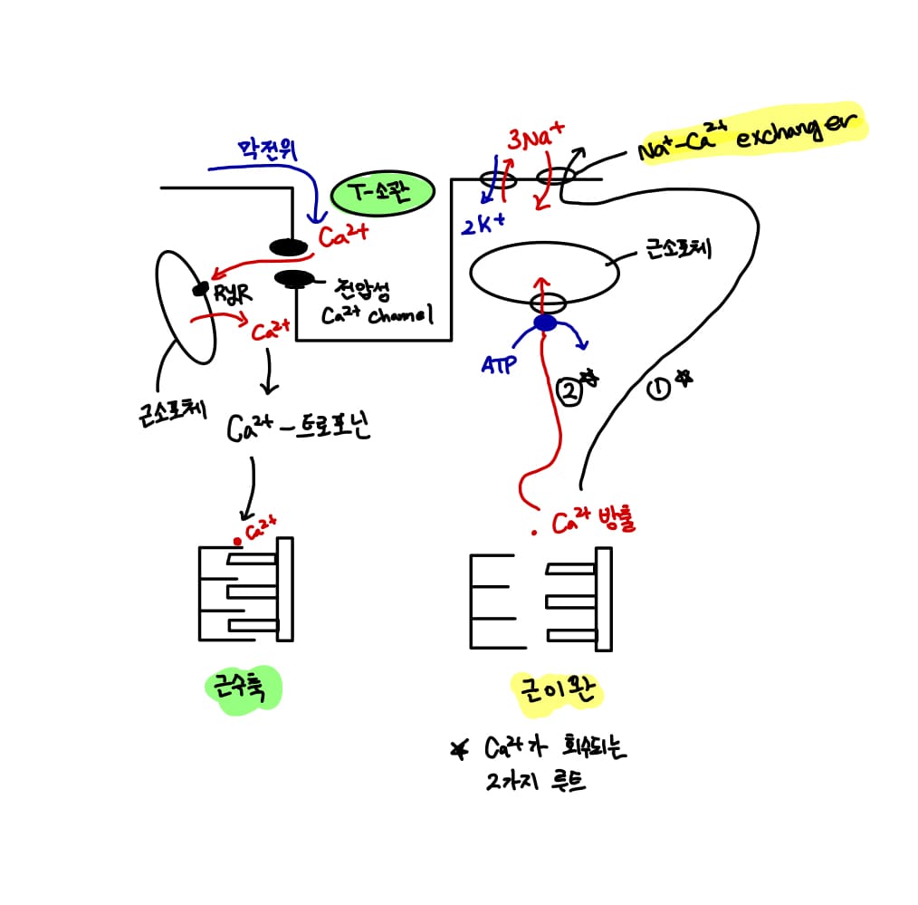- Na+/K+ 채널에 의해 생긴 농도 기울기로 Ca2+을 회수하는 Na+-Ca2+ exchanger (역방향 수송체)에 의해 회수됨