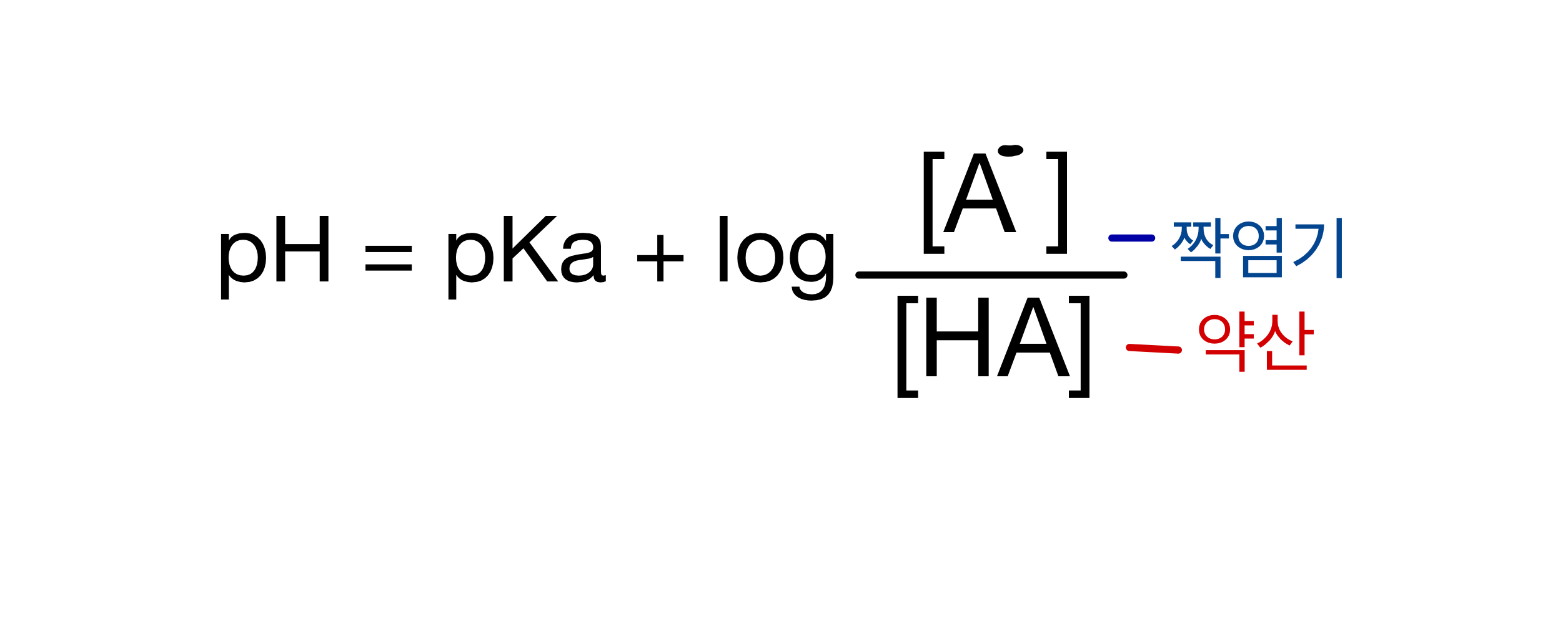 2. Henderson-Hasselbalch equation: 헨더슨-하셀바흐 방정식. 완충용액의 pH를 구할때 쓰는 공식이며 이 단원에서 가장 중요한 공식이니 꼭 암기 하도록하자.