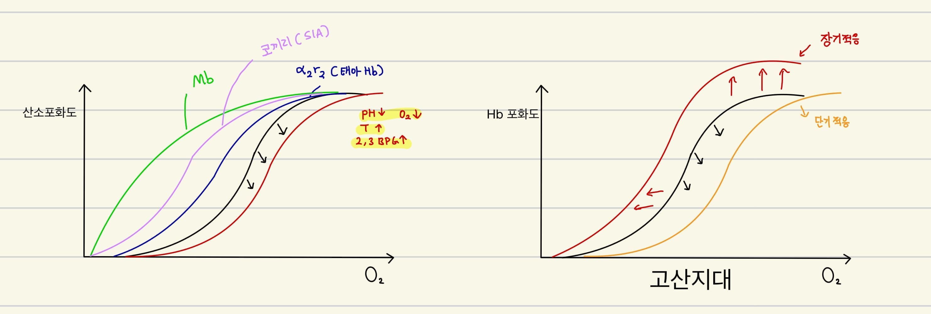 - 고지대에 초기에는 낮은 산소의 분압으로 2,3 BPG가 증가하여 헤모글로빈의 산소 친화력이 감소한다.