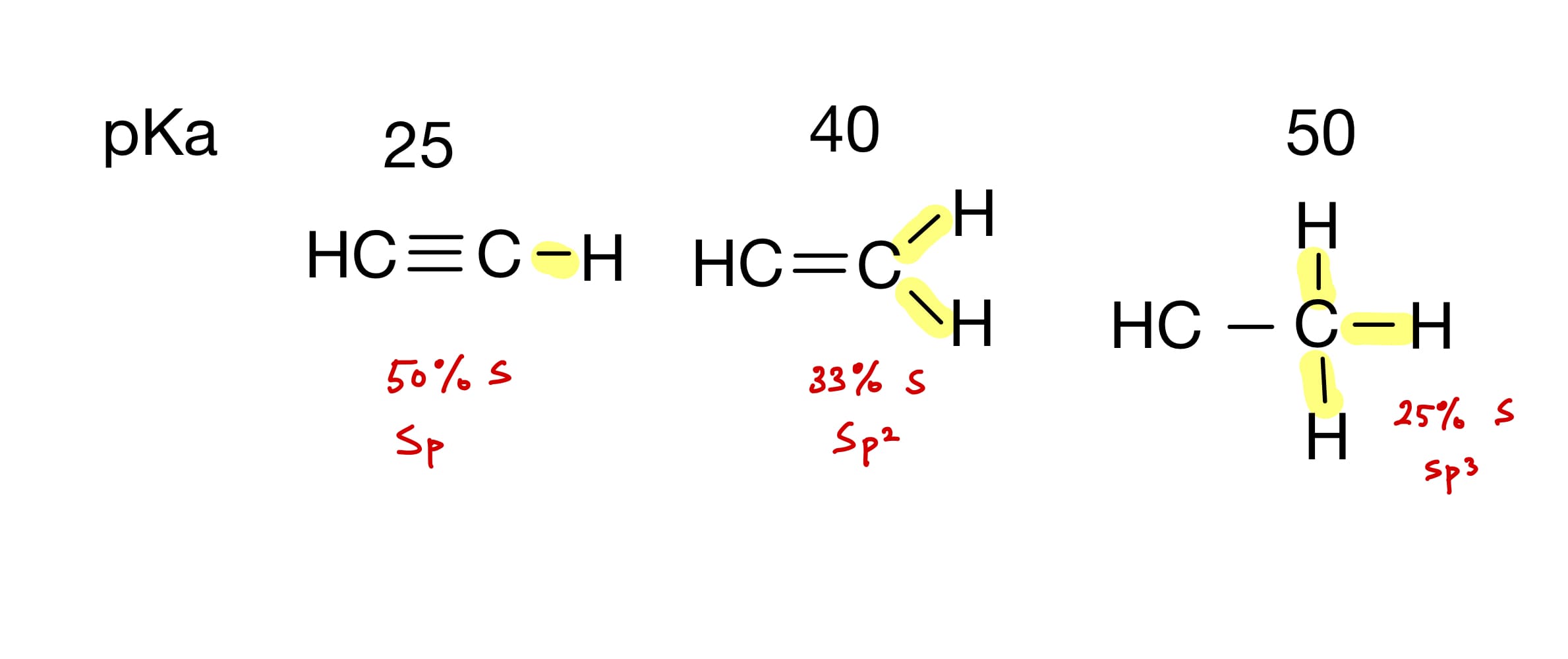 - sp³ 는 (s + p + p + p)로 25%의 S 캐릭터를 가지고 있으며 순서대로 sp² 는 33% sp는 50%로 볼수 있으며 s 캐릭터가 커질수록 더 강한 산이다.