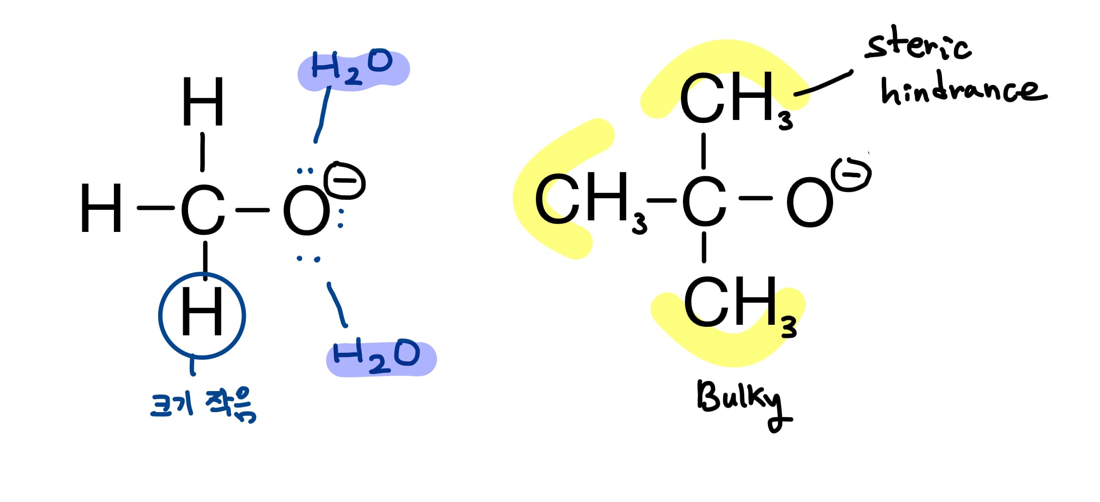 - 메탄올은 크기가 작은 수소가 붙어 있어 용매가 음전하를 효율적으로 둘러싸서 안정화를 시키는 반면에 tert-Butanol은 크기가 큰 즉 bulky한 CH3기가 입체장애를(steric hindrance) 유발하여 용매가 음전하게 접근하지 못하고 그로인해 용매화로 인한 안정화가 힘드니 메탈올보다 불안정한 짝염기를 생성할수 밖에 없다.