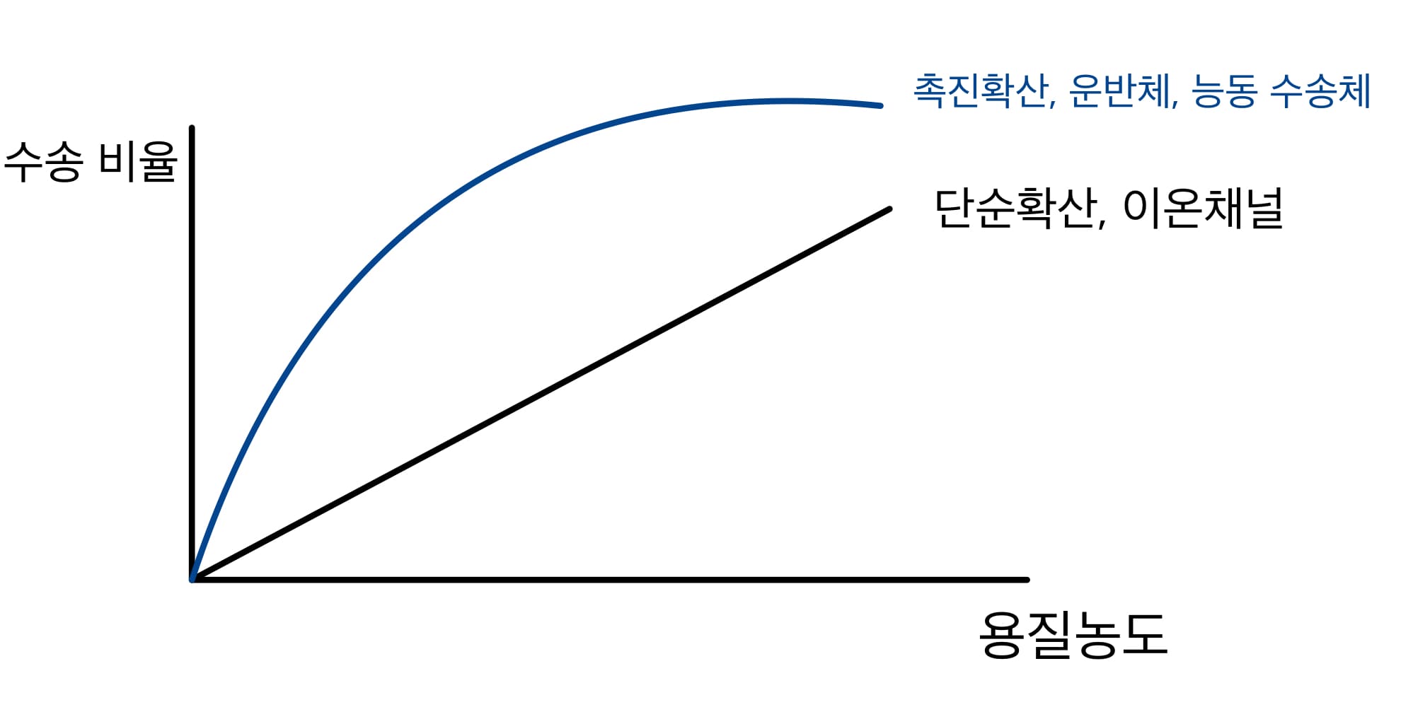 - 미하엘리스-멘텐식을 따르며 수송 물질의 농도가 일정 수치 이상이면 포화된다. 하지만 단순 이온 통로를 사용하는 수송에서는 포화되지 않음