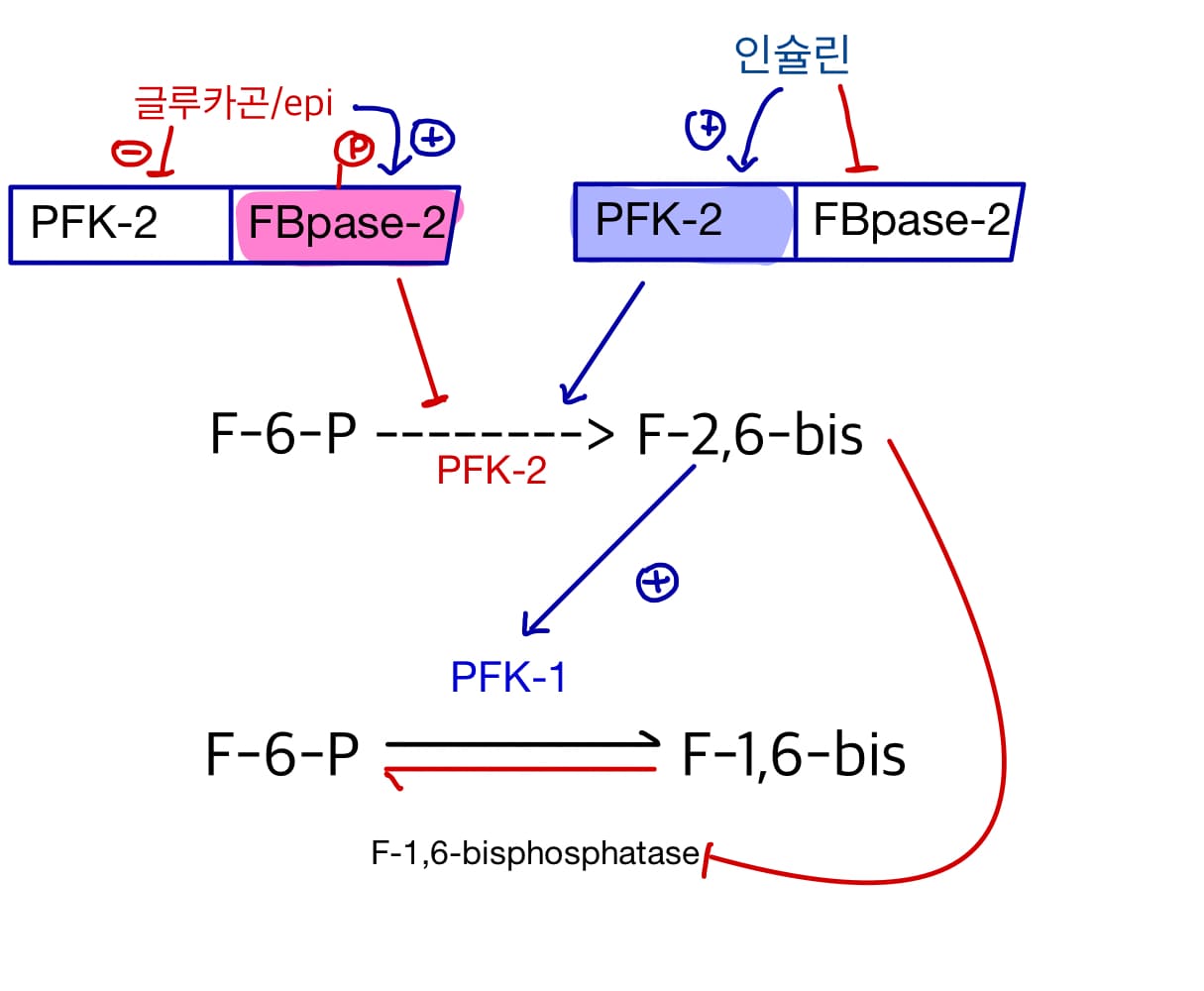 - 인슐린(인산기 제거) : PFK-2 활성화 → F26bisp → PFK-1